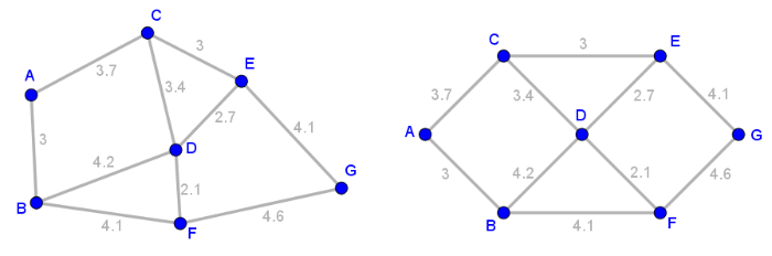 GeoGebra werkt zuiver meetkundig en kan enkel rekenen met de lengte van lijnstukken als maatgetal.[br]Het verslepen van knopen wijzigt de situatie en leidt tot andere oplossingen, wat atypisch is voor grafen. [br]Kortste pad opgaven worden dan ook meestal voorgesteld en opgelost door niet met de lengtes van de bogen te rekenen, maar de bogen een gewicht toe te kennen. We spreken dan van [i]gewogen grafen[/i].[br]Zo zijn in figuur 1 de bogen getekend volgens de lengte van de lijnstukken, terwijl figuur 2 een overzichtelijke graaf is waarin de lengte van de getekende lijnstukken losstaat van het gewicht van de bogen. [br]Dit is ook wat in de praktijk gebeurt. Een web van lijnstukken is immers veel te rigide om reële wegentracés en afstanden te tekenen. Met drie knopen lukt het nog, maar verder zullen de lijnstukken niet meer sluiten, zodat je wel met gewichten moet werken i.p.v. met lijnstukken waarvan de lengtes evenredig zijn met de reële afstanden.