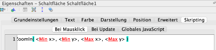 Ist die Schaltfläche erzeugt kann man mit einem Rechtsklick auf die Schaltfläche, die Eigenschaften ändern.[br]Hier wählt man die Registerkarte "Scripting" aus und verwendet den Befehl ZoomIn[][br] [br]Mit [i]ZoomIn( , , , )[br][/i][br]kann man gezielte Fensterwerte einstellen, z.B.[br]ZoomIn(-5, -2, 5, 2 )[br][br]Stellt den Fensterbereich -5<x<5 und -2<y<2 ein.