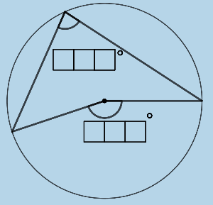 Drag numbers in the boxes to create an inscribed angle and central angle. The figure will be drawn to scale on the right. Here, (on the right), you may have to move points to see the entire setup you create.