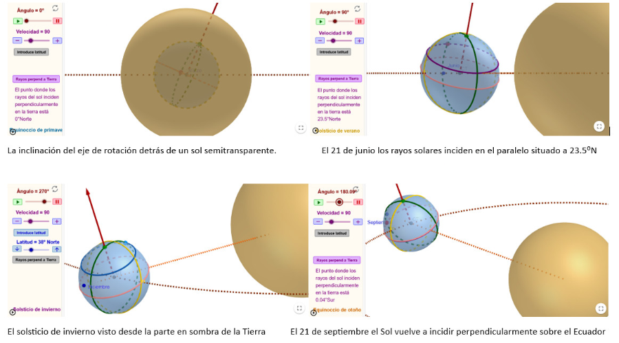 El eje de rotación de la Tierra está inclinado un ángulo aproximado de 23.5º respecto de la recta perpendicular al plano que contiene la órbita que recorre nuestro planeta alrededor del Sol.[br][br]El objetivo de este applet es mostrar una de las causas que provocan las estaciones. Los cálculos no son exactos: para simplificar, la órbita se ha dibujado circular, el año tiene 360 días y ni los tamaños del Sol, ni el de la Tierra ni la distancia entre ellos mantienen las proporciones reales.[br][br]Podemos colocar un punto sobre la esfera terrestre que se pondrá a girar con la tierra sobre la circunferencia que corresponde al paralelo:[br][list][*]Con [b][color=#0000ff]Introduce latitud[/color][/b] aparece un deslizador ([color=#0000ff][b]azul[/b][/color]) que permite situarlo desde el Polo Norte (latitud=90º N) al Polo Sur (90º S) pasando por el Ecuador (0º).[/*][*]Con [color=#741b47][b]Rayos perpendiculares a la Tierra[/b][/color] el punto ([b][color=#ff0000]rojo[/color][/b]) se sitúa en la región de la Tierra que recibe los rayos del Sol perpendicularmente.[/*][/list]Sobre la esfera terrestre han marcado otros puntos y líneas notables:[br][list][*]El punto [b][color=#38761d]verde[/color][/b] es el Polo Norte.[/*][*]Por el punto de la posición del punto terrestre tenemos un círculo también verde que es el meridiano verde y un círculo azul que representa el paralelo.[/*][*]La circunferencia amarilla representa la zona de la Tierra expuesta a la insolación.[/*][*]La circunferencia naranja marca el Ecuador terrestre[/*][*]El vector rojo atraviesa la Tierra por los polos y marca el eje de rotación terrestre.[/*][/list][br]El ángulo[code][/code] marcado en la parte superior izquierda determina la posición de la Tierra alrededor del Sol. 0º indica que la Tierra se encuentra en el equinoccio de primavera (marzo). El incremento del ángulo dará lugar a la rotación de la Tierra alrededor del Sol (poner velocidades altas) y también 360 giros alrededor de su eje (disminuir la velocidad si queremos estudiar con más detenimiento este movimiento de rotación alrededor de su eje).