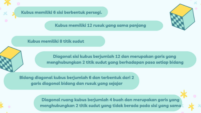 [color=#1e84cc][size=85][size=100]Sebelum kita mempelajari tentang kubus, coba perhatikan benda-benda di sekitar kita! Apakah kalian pernah melihat dadu, kotak tisu, atau rubik? Semua benda tersebut memiliki bentuk yang sama, yaitu kubus. Bentuk kubus banyak ditemukan dalam kehidupan sehari-hari. Nah, pada pembelajaran kali ini, kita akan mengenal lebih dalam mengenai kubus, mulai dari konsepnya, rumus luas permukaan dan volumenya, hingga penerapannya dalam kehidupan sehari-hari.[/size][/size][/color]