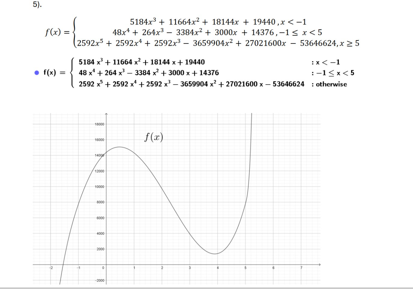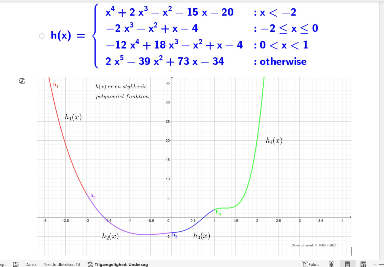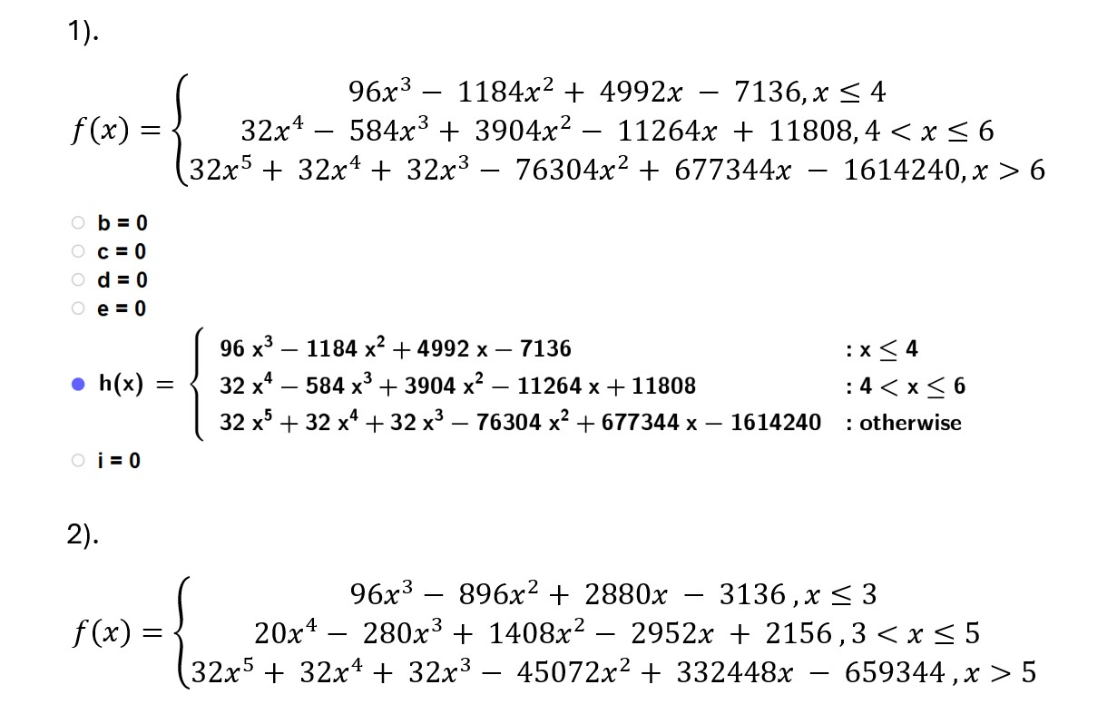 [br][br]Pæne stykkevise polynomielle funktioner. (Se billedet)[br]Definition. [br]En stykkevis funktion,som er defineret på et åbent eller halvlukket interval og som udelukkende har[br]polynomier som delfunktioner og som er to gange differentiabel med heltallig[br]funktionsværdi og heltallige værdier for første og anden afledede i alle[br]delepunkterne kaldes for en ”pæn stykkevis polynomiel funktion”.[br]Opgaver. [br]Vis at de tre stykkevise funktioner nedenfor (i billederne) alle er Pæne stykkevise polynomielle funktioner.[br]Opgave for entusiaster:[br]Udled en formel, som parametriser sådanne funktioner i det tilfælde hvor der er[br]tre polynomier af hhv. grad 3, 4 og 5 og i samme rækkefølge i tre ’fremadskridende’[br]delintervaller – præcis ligesom funktionerne nedenfor.[br][br][br]