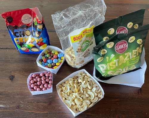 Ein Beispiel: Einer Gruppe steht eine Packung mit 500g Erdnüssen zur Verfügung. Auf der Feier soll damit an vier verschiedenen Stellen eine Schachtel bereitgestellt werden, demnach beträgt eine Portion 125 g. Diese abgewogene Menge an Erdnüssen ergibt in einem Messbecher ein Volumen von 200 ml. Die Gruppe entscheidet sich für eine sehr flache Schachtel mit einer Höhe von 2 cm, die jeweils bis zum Rand gefüllt werden soll.