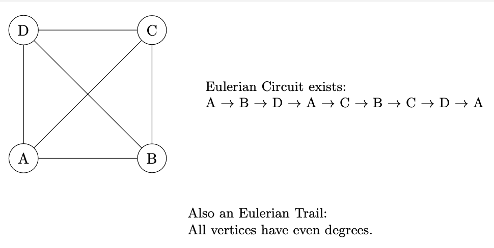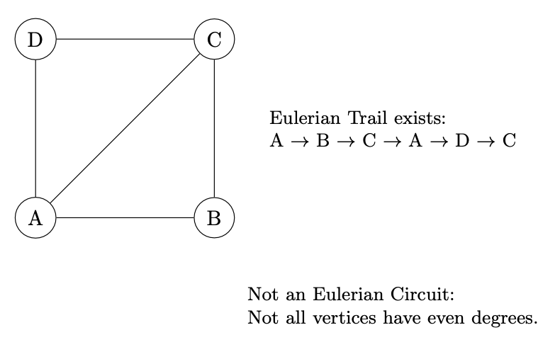 Eulerian Trails and Circuits: An Eulerian trail is a trail in a graph that visits every edge exactly once. If such a trail exists that starts and ends at the same vertex, it’s called an Eulerian circuit.