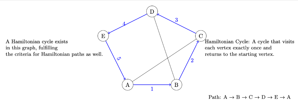 Hamiltonian Paths and Cycles: A Hamiltonian path is a path that visits each vertex in the graph exactly once; if the path is a cycle, then it’s called a Hamiltonian cycle.