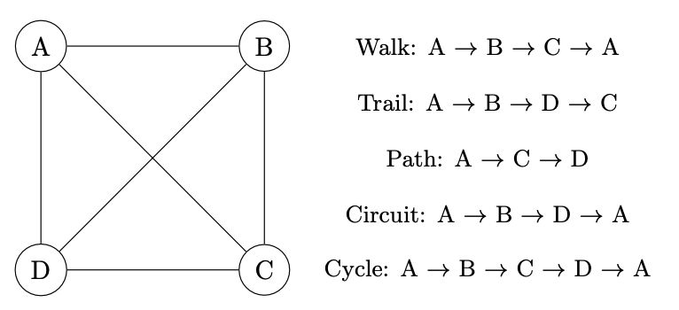 AHL 3.16[br][br]Tree and Cycle Algorithms with Undirected Graphs: This refers to algorithms that operate on undirected graphs to identify trees (graphs with no cycles) and cycles (closed paths where the first and last vertices are the same).[br][br]Walks, Trails, Paths, Circuits, Cycles: These are different ways to traverse graphs.[br][br]• Walk: A sequence of edges and vertices wherein vertices (and possibly edges) can be repeated.[br]• Trail: A walk where no edges are repeated.[br]• Path: A trail where no vertices are repeated.[br]• Circuit: A trail that starts and ends at the same vertex.[br]• Cycle: A circuit that only repeats the starting/ending vertex.[br]
