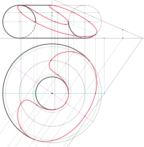 Adott egy, az első képsíkon álló tórusz és egy dőlt sík Monge-projekcióban. Szerkesztendő a síkmetszet.[br](A láthatóság a második ábrán található.)