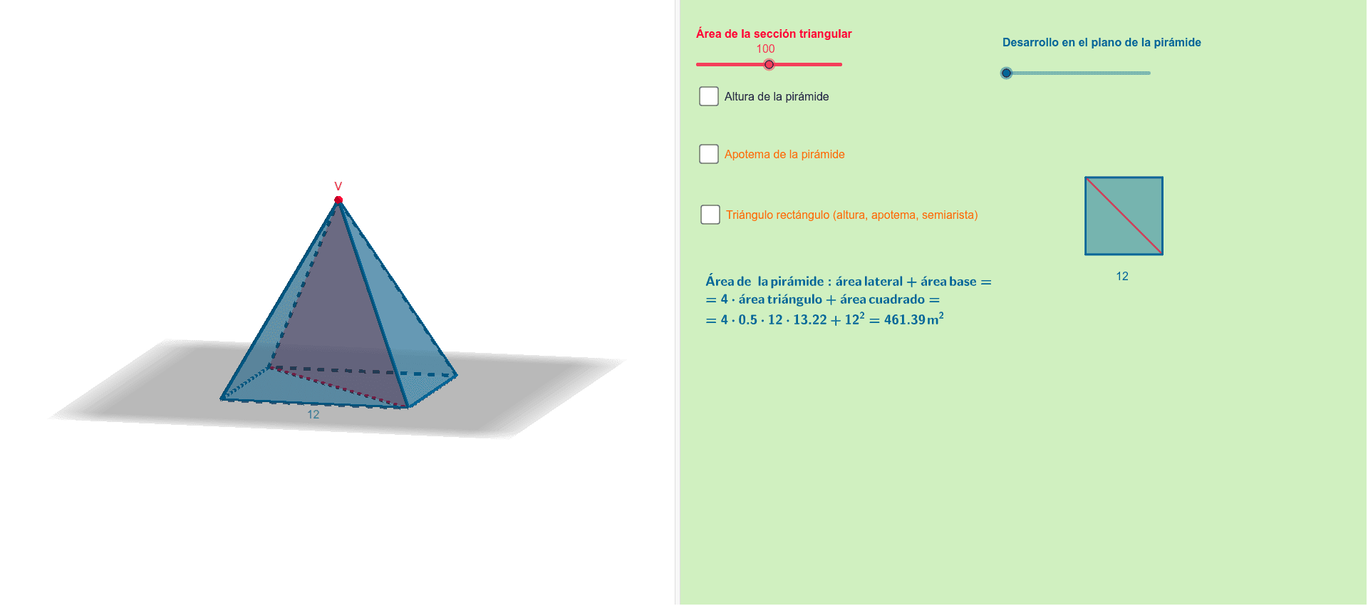 El problema de calcular el área de la pirámide, conocida su arista básica, se reduce a hallar la apotema de la pirámide. [br][br]La [b]apotema de la pirámide [/b]se calcula aplicando el teorema de Pitágoras en el triángulo rectángulo de hipotenusa la apotema y catetos, la altura de la pirámide y la arista partida por dos. [br][br]Necesitamos, por tanto, hallar la [b]altura de la pirámide[/b] para resolver el problema. Para ello, tendremos en cuenta que es la altura de un triángulo isósceles del que conocemos el área y la el lado desigual (diagonal del cuadrado base de la pirámide).[br][br]Nota: La resolución permite variar el área de la sección mediante el deslizador "área de la sección triangular".