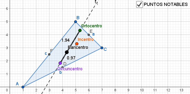 1º.- Seleccionar la pestaña "RECTA DE EULER".[br]2º.- Trazar la recta que pasa por el circuncentro y el ortocentro.[br][list][*]Condición para mostrar el objeto: "bisectrices".[/*][*]Estilo: Discontinuo.[/*][/list]3º.- Comprobar que el Baricentro, el Circuncentro y el Ortocentro están siempre alineados.[br]4º.- Trazar los segmento que unen el Baricentro con el Circuncentro y el Ortocentro.[br][list][*]Condición para mostrar el objeto: "bisectrices".[/*][*]Etiqueta: Valor.[/*][/list]5º.- Comprobar que la distancia al Ortocentro es el doble que al Circuncentro.