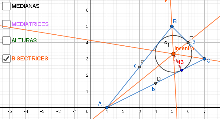 1º.- Seleccionar la pestaña "BISECTRICES".[br]2º.- Trazar la recta perpendicular a un lado que pasa por el incentro.[br]3º.- Marcar la intersección del lado y su perpendicular.[br]4º.- Trazar el segmento que una el punto de intresección y el incentro (distancia del incentro a un lado)[br][list][*]Condición para mostrar el objeto: "bisectrices".[/*][*]Etiqueta: Valor.[/*][/list]5º.- Crear la circunferencia de centro el incentro y de radio el segmento creado anteriormente.[br][list][*]Condición para mostrar el objeto: "bisectrices".[/*][/list]6º.- Comprobar que la circunferencia es tangente a los tres lados (circunferencia INSCRITA).[br]