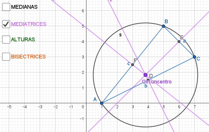 1º.- Seleccionar la pestaña "MEDIATRICES".[br]2º.- Crear la circunnferencia de centro el Circuncentro y punto uno de los vértices del triángulo.[br][list][*]Condición para mostrar el objeto: "mediatrices".[/*][/list]3º.- Comprobar que la circunferencia pasa por los tres vértice del triángulo (circunferencia CIRCUNSCRITA).[br]