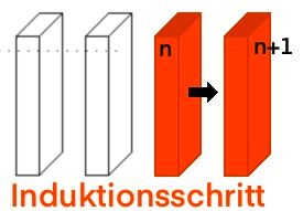 Grundsätzlich ist das Induktionsprinzip also eine Aussage über Teilmengen von [math]\mathbb{N}[/math].[br]Anhand von Dominosteinen können wir uns nun vorstellen, wie daraus ein Beweisprinzip wird. Diese Dominosteine sollen für die unendlich vielen natürlichen Zahlen stehen. Damit alle Steine umfallen, braucht man zwei Bedingungen:[br]1. Der erste Stein muss umfallen ([color=#00ff00]Induktionsanfang[/color]).[br]2. Betrachtet man irgendeinen beliebigen aber festen Stein und nimmt an, dass dieser umfällt ([color=#ff7700]Induktionsvoraussetzung[/color]), [br]so muss man folgern können, dass sein Nachfolger ebenfalls umfällt ([color=#ff0000]Induktionsschritt[/color]).