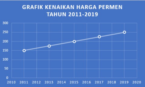 [size=100][size=150]Misalkan [color=#0000ff][b]harga permen[/b][/color] sebagai variabel [color=#0000ff][b][i]y [/i][/b][/color]dan [color=#ff0000][b]tahun[/b][/color] sebagai variabel [color=#ff0000][i][b]x[/b][/i][/color]. Kemudian, kita pilih selang tahun antara 2011 - 2019. Kita perkirakan harga permen di tahun 2011 seharga Rp150/buah dan setiap dua tahun sekali, harga permen meningkat secara tetap sebesar Rp25/buah hingga mencapai harga Rp250/buah di tahun 2019. Untuk lebih jelasnya perhatikan tabel berikut ini.[br][br][table][tr][td] x[/td][td] y[/td][/tr][tr][td]2011[/td][td]150[/td][/tr][tr][td]2013[/td][td]175[/td][/tr][tr][td]2015[/td][td]200[/td][/tr][tr][td]2017[/td][td]225[/td][/tr][tr][td]2019[/td][td]250[/td][/tr][/table][b][color=#0000ff][br]Bentuk grafiknya seperti di bawah ini.[/color][/b][br][/size][/size]