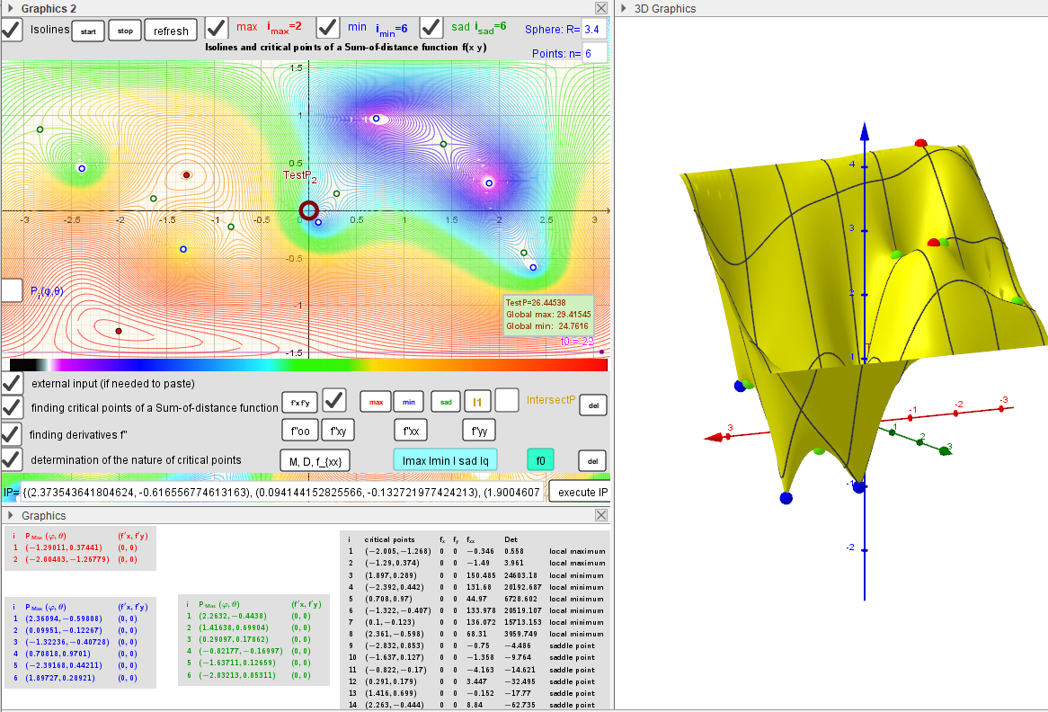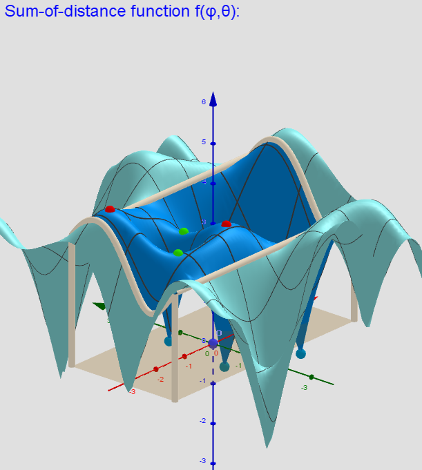 [size=85] Let Pi=(xi,yi,zi) n moving points in ℝ³ (lP:={P1,P2,...,Pn}). I want to find the points P=(x,y,z) on the surface of the sphere -S (radius R) that are critical (relative min/max or saddle points at (x,y,z)) of a function f(x,y,z):=-sum of the distances from P to the all points from lP. Critical points can be found using Lagrange multipliersas finding the Extreme values of the function f(x,y,z) subject to a constraining equation g(x,y,z):=x[sup]2[/sup]+y[sup]2[/sup]+z[sup]2[/sup]-R[sup]2[/sup]=0. There is a system of equations: ∇f(x,y,z)= λ∇g(x,y,z). A local optimum occurs when ∇f(x,y,z) and ∇g(x,y,z) are parallel, and so ∇f is some multiple of ∇g. [br] This applet illustrates distributions of geometric medians on a sphere of radius R "induced" by a discrete sample of moving points in three-dimensional space.[br]Description in [url=https://www.geogebra.org/m/y8dnkeuu]https://www.geogebra.org/m/y8dnkeuu[/url][br]Applets: [br][url=https://www.geogebra.org/m/bm76gdkb]Example[/url] of Applet in which 3 moving points in three-dimensional space "induce" 8 geometric medians on a sphere. [br][url=https://www.geogebra.org/m/avps5da6]Example[/url] of Applet in which 6 moving points in three-dimensional space "induce" 14 geometric medians on a sphere.[/size][br]