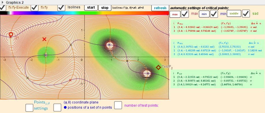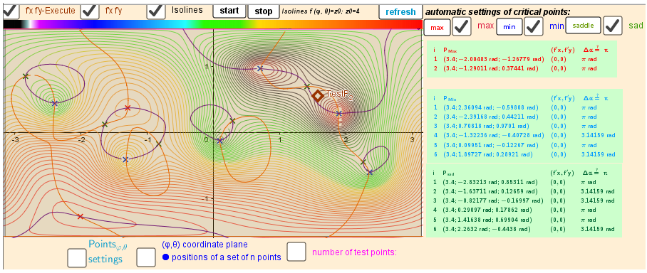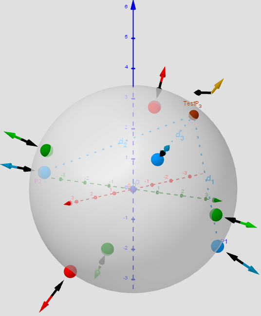 [size=85]Distribution of points P[sub]i, [/sub][color=#5b0f00]test Point[/color][sub], [/sub] [color=#ff0000]Max[/color]/[color=#0000ff]min[/color]/[color=#38761d]saddle[/color] -[color=#333333]Critical points[/color] on a sphere. Vectors ∇f and ∇g at these points. n=3.[/size]