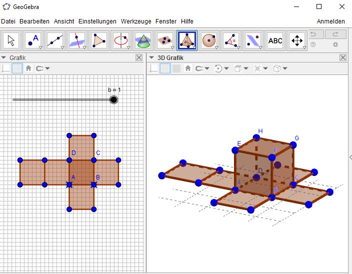 Im Prinzip steckt hinter dieser Konstruktion der Befehl "Netz" [icon]/images/ggb/toolbar/mode_net.png[/icon][br][br]Mögliche Konstruktionsschritte:[br][list][*]in der Grafik-Ansicht zwei Punkte festlegen.[/*][*]Wechsel in die 3D-Grafik und mit [icon]/images/ggb/toolbar/mode_cube.png[/icon] den Würfel vervollständigen.[/*][*]mit der Funktion [icon]https://www.geogebra.org/images/ggb/toolbar/mode_net.png[/icon] das Würfelnetz erzeugen[/*][*]das Grafik-Fenster zusätzlich anzeigen lassen (Menü Ansicht) und den Schieberegler identifizieren.[/*][*]Evtl. Animation des Schiebereglers bearbeiten.[br][/*][/list]