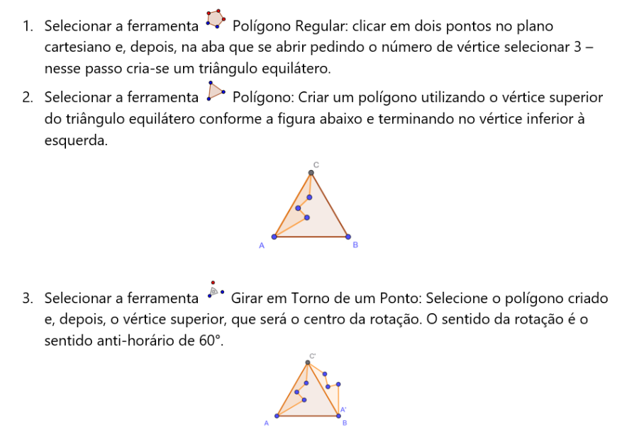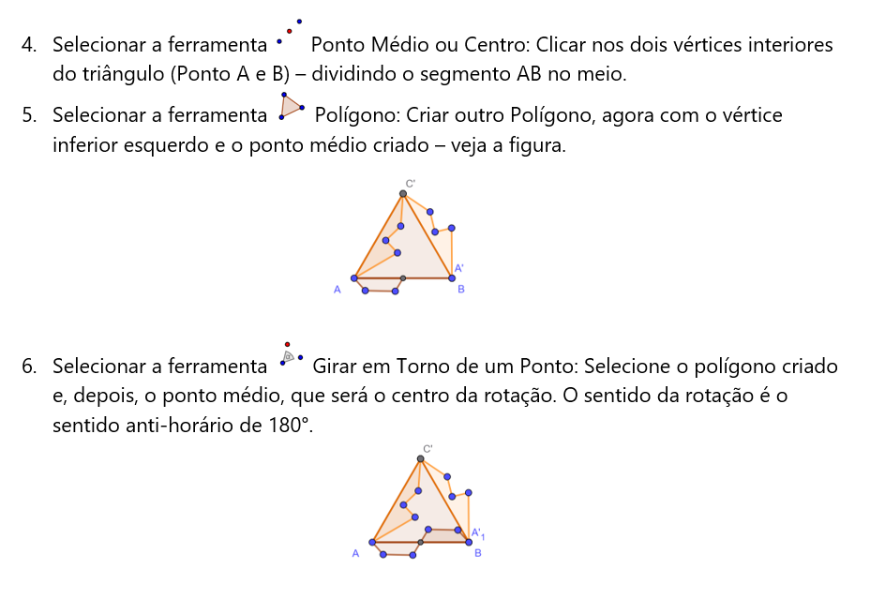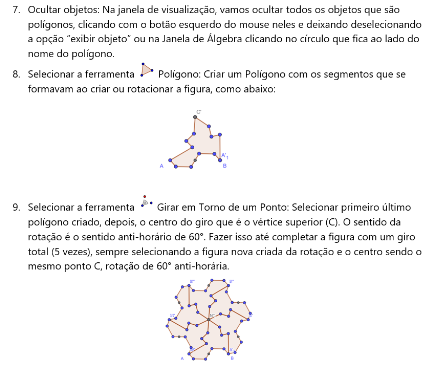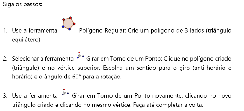 Resposta: A figura usada inicialmente é um triângulo equilátero e já pode ser usada para pavimentar todo[br]o plano. As transformações usadas nela são isométricas e preservam as medidas da figura. Além disso, também se usa da simetria da própria figura – o ponto médio de um dos seus lados. [br]
