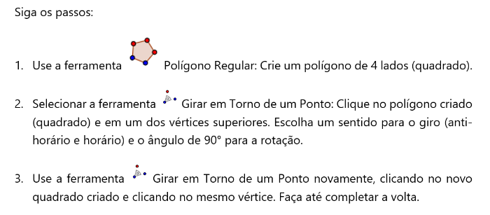 Agora, vamos aprender uma prática de criação de figuras para pavimentação. Essa técnica é a mesma usada pelo artista holandês M. C. Escher.[br]4) Pavimentação por rotação: