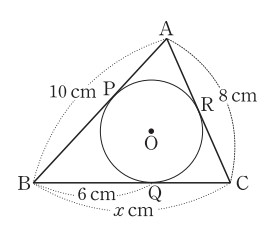 [b][color=#0000ff][문제 2][/color][/b] 아래 그림에서 원 O는 △ABC의 내접원이고, 세 점 P, Q, R은 각각 원 O의 접점이다.[br] [math]\overline{AB}=10cm[/math], [math]\overline{BQ}=6cm[/math], [math]\overline{CA}=8cm[/math]일 때, [math]x[/math]의 값을 구하시오.