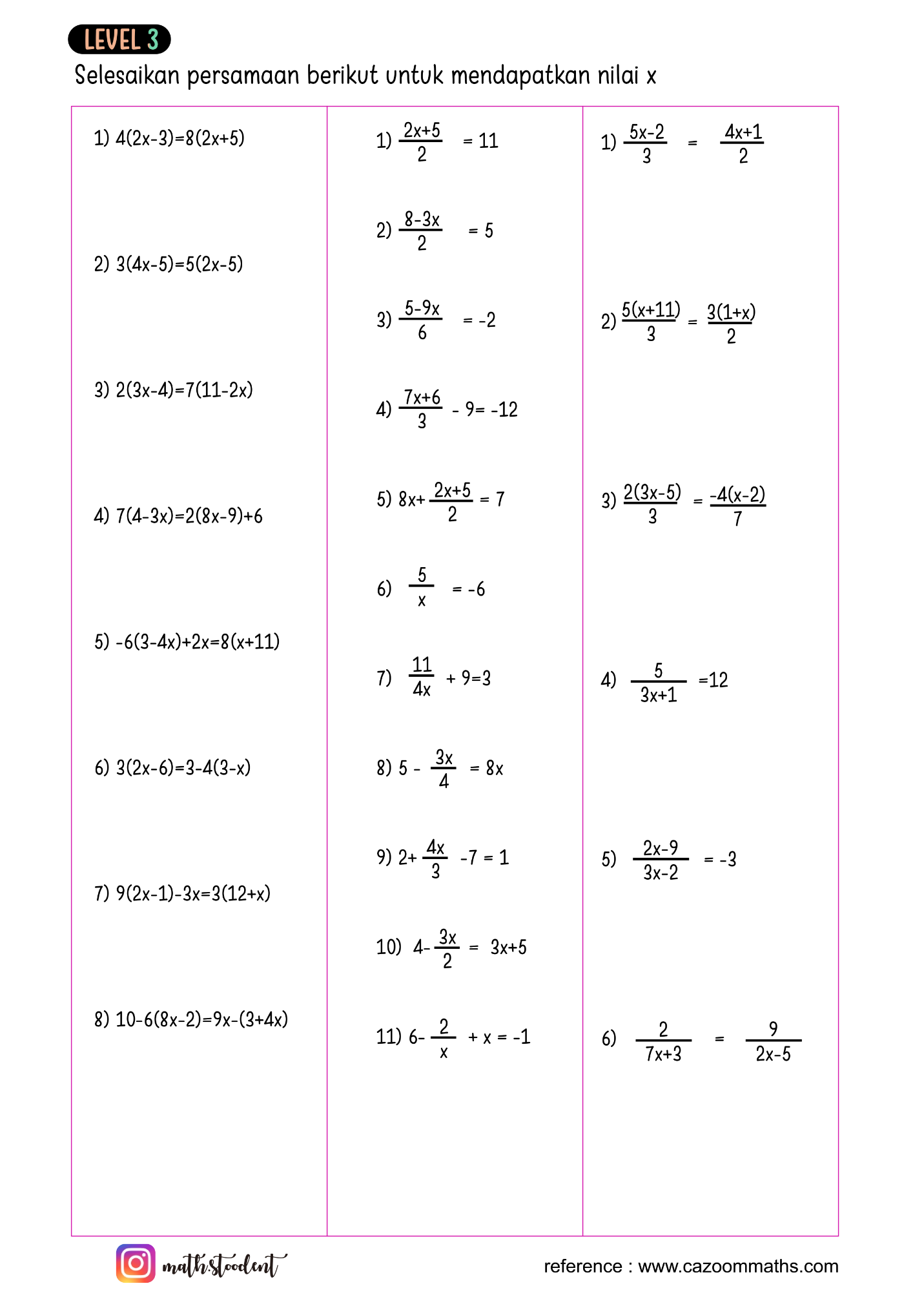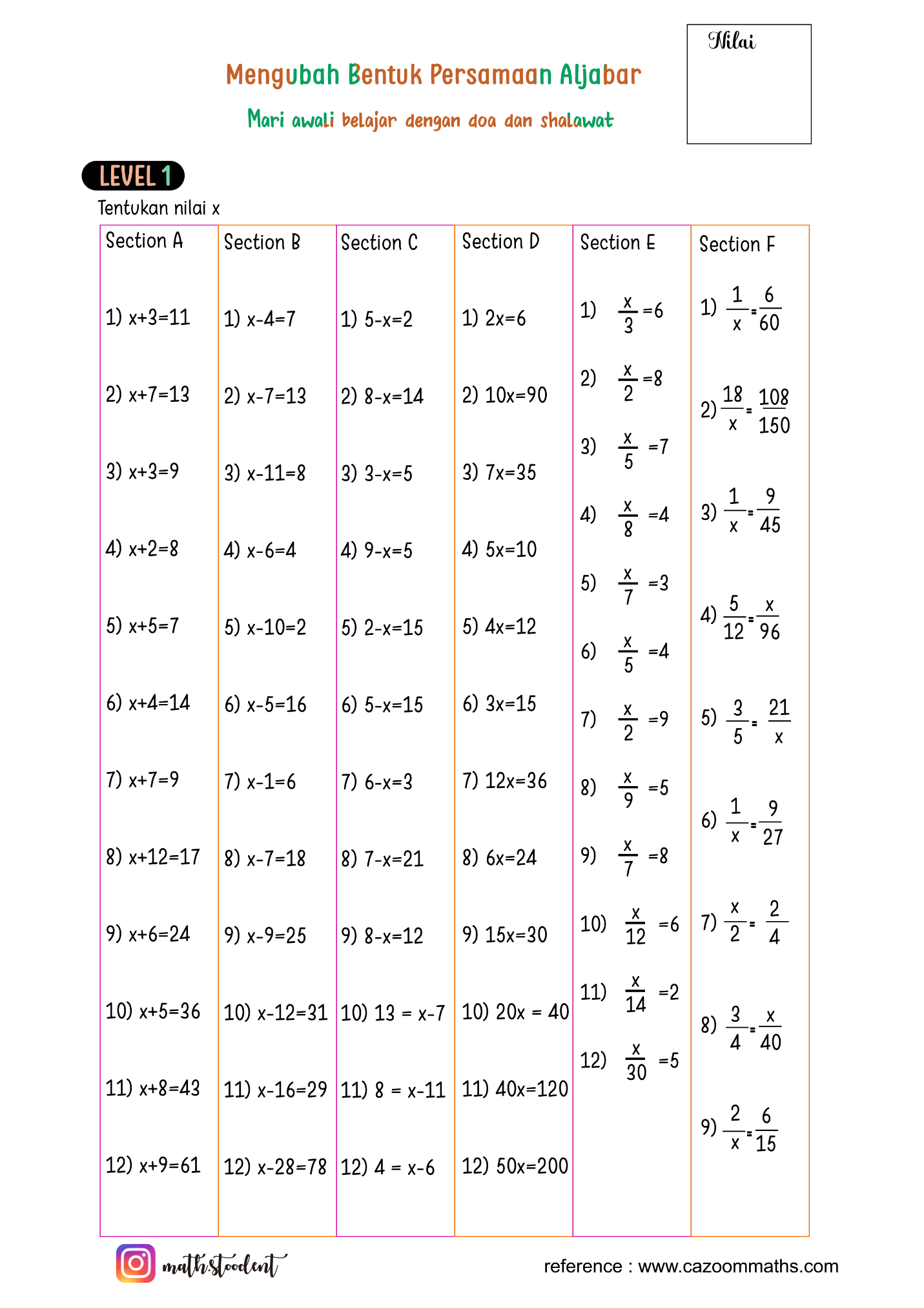 [list=1][*]Jika jumlah uangmu dan uang adikmu adalah Rp50.000, dan kamu tahu kamu punya Rp30.000, bagaimana cara mencari tahu berapa uang adikmu?[br][/*][*]Kamu membeli 3 pensil dengan harga yang sama, dan totalnya Rp9.000. Bagaimana kamu mencari harga satu pensil tanpa menebak?[br][/*][*]Saat kamu membaca bahwa “dua kali suatu bilangan dikurangi 5 hasilnya 9,” apakah kamu bisa mencari bilangan itu? Bagaimana cara menuliskannya dalam bentuk matematika?[br][/*][*]Pernahkah kamu memecahkan teka-teki yang berbunyi: “Sebuah angka ditambah 7 hasilnya 15”? Apakah ada cara pasti untuk menemukannya?[br][/*][*]Jika kamu tahu berat total 3 kantong gula adalah 6 kg, dan semua kantong berisi jumlah gula yang sama, bagaimana kamu menentukan berat satu kantong?[/*][*]Pernahkah kamu menyusun suatu perhitungan supaya hasilnya pas dengan angka tertentu? Apakah itu bisa disebut persamaan?[/*][/list]