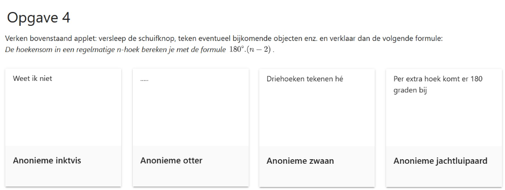 Een ander type van opgaven zijn open vragen. [br]Ook de leerlingenantwoorden op open vragen wijzigen in realtime. [br]Je kunt op een leerling klikken om zijn/haar antwoorden in detail te bekijken.[br]Via de knop [i]Voorbeeldantwoord [/i]onderaan kan je zelf kiezen of leerlingen al dan niet voorbeeldantwoorden kunnen bekijken.[br]Verder kan je via de pijlknoppen bovenaan navigeren van het werk van een leerling naar dat van een andere leerling.