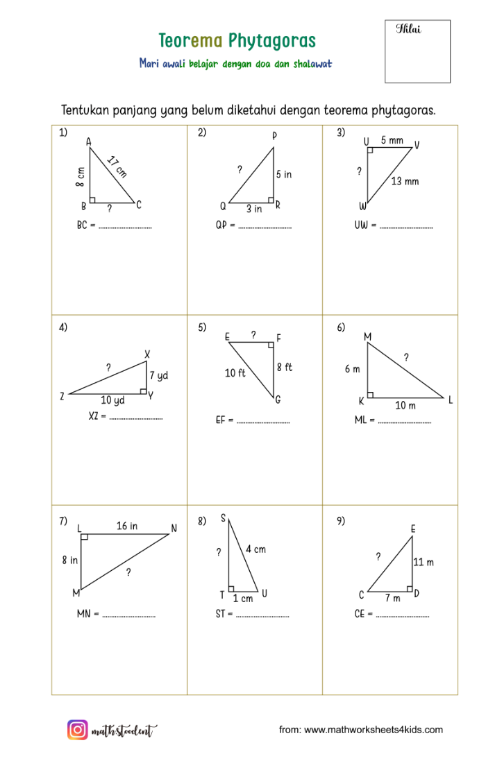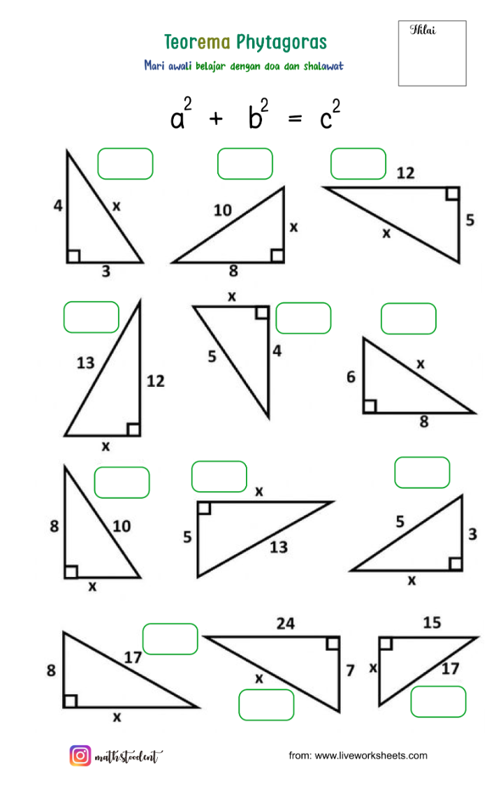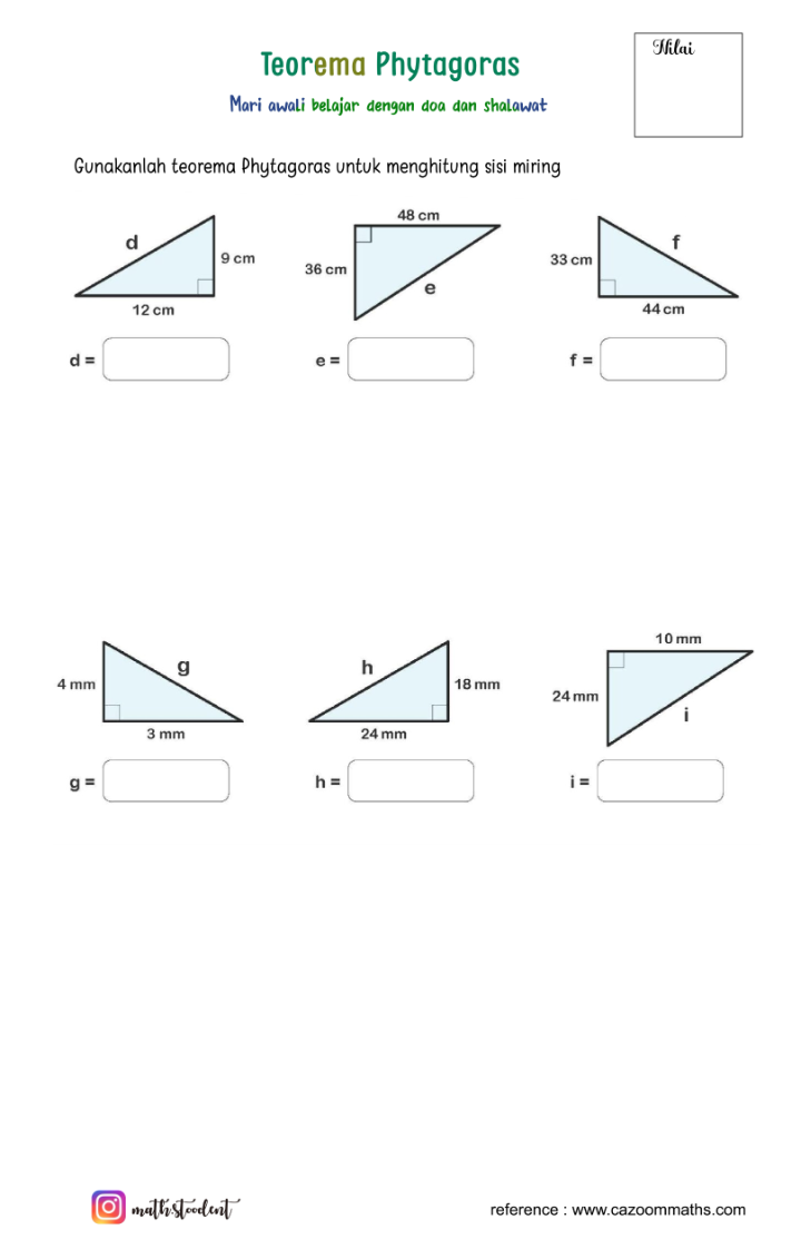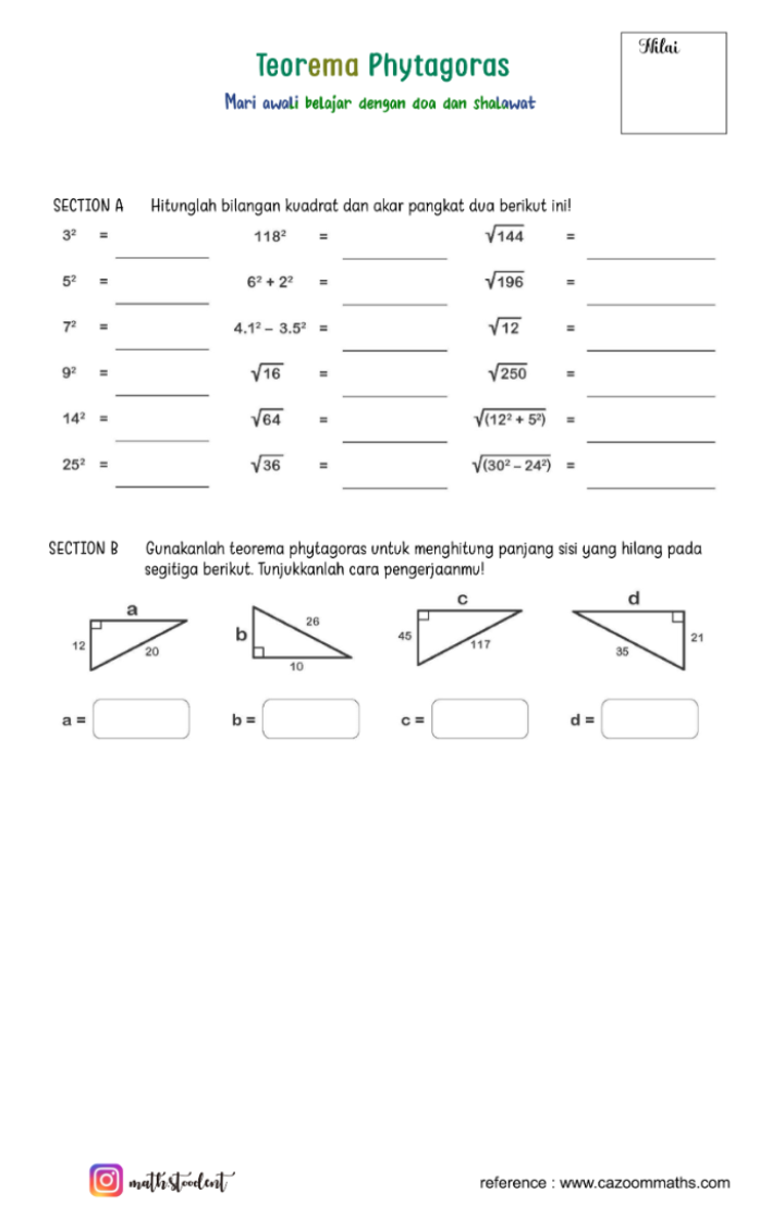 [list=1][*]Jika kamu berjalan lurus ke timur sejauh 3 meter, lalu ke utara sejauh 4 meter, berapa jarak langsungmu dari titik awal?[/*][*]Mengapa dalam segitiga siku-siku, sisi miring (hipotenusa) selalu lebih panjang dari sisi lainnya?[/*][*]Apakah kamu pernah melihat bangunan atau tangga yang membentuk sudut siku-siku? Bagaimana cara menghitung panjang sisi miringnya?[/*][*]Apa yang terjadi jika kamu menggambar kotak di setiap sisi segitiga siku-siku?[/*][*]Mengapa Teorema Pythagoras hanya berlaku pada segitiga siku-siku[/*][/list]