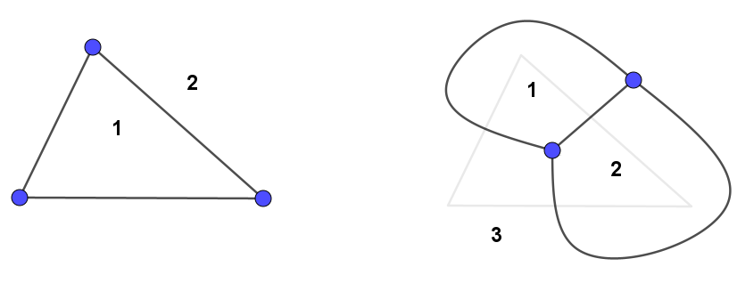 [size=85]A la izquierda, un triángulo (tres vértices) divide al plano en dos regiones. A la derecha, su grafo dual (dos vértices) divide al plano en tres regiones. Observa que el grafo dual del de la izquierda vuelve a ser el de la derecha.[/size]