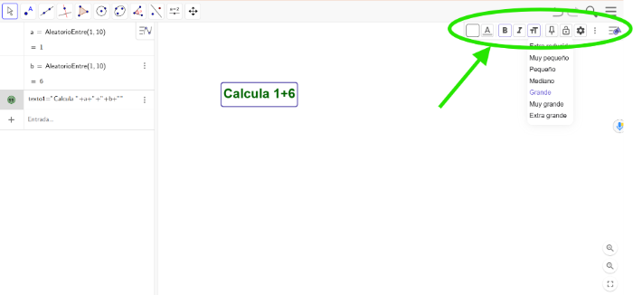 [b]PASO 2 – Crear el enunciado dinámico[br][/b][br]Queremos mostrar un texto que diga algo como:[br][b]“Calcula 3 + 7”[/b], donde los números cambian automáticamente cada vez que se reinicia la construcción.[br][br][list=1][*]Selecciona la [b]herramienta Texto [icon]/images/ggb/toolbar/mode_text.png[/icon][/b].[br][/*][*]Haz clic en cualquier punto del lienzo donde quieras colocar el texto.[br][/*][*]Se abrirá un cuadro con varias secciones (texto, vista previa, opciones de variables, etc.).[br][/*][*]En la parte superior del cuadro, escribe:[br] [code]Calcula [/code][br][/*][*]Luego, [b]sin cerrar el cuadro[/b], pulsa en la pestaña [b]GeoGebra [/b](la que muestra tus objetos [code]a[/code] y [code]b[/code]) y haz clic sobre ellos en este orden:[br][br][/*][list=1][*]primero [code]a[/code][br][/*][*]luego escribe manualmente el signo “[code]+[/code]”[br][/*][*]después pulsa sobre [code]b[/code][br][/*][/list][/list][br]En la [b]vista previa[/b], deberías ver algo como:[br][br][list][*]Calcula 3 + 7[/*][/list][br]Finalmente, pulsa [b]OK[/b]. El texto aparecerá en la pantalla, y si actualizas la construcción, verás cómo cambian los números.[br][br][b][i](OPCIONAL)[/i]– Personaliza tu enunciadopara mejorar la presentación del ejercicio:[br][/b][br][list=1][*]Selecciona la [b]herramienta de ratón[/b] [icon]/images/ggb/toolbar/mode_move.png[/icon] en la barra superior.[br][/*][*]Haz clic sobre el texto que acabas de crear (“Calcula … + …”)[br][/*][*]En la parte superior derecha de la pantalla, aparecerá una [b]barra de formato[/b] con opciones para:[br][/*][list][*]cambiar el [b]tamaño [/b]del texto,[br][/*][*]el [b]color[/b],[br][/*][*]el [b]tipo de fuente[/b],[br][/*][*]o incluso el [b]alineado[/b].[br][/*][/list][*]Ajusta los parámetros hasta que el texto sea claro y visible.[b][br][/b][/*][/list][br]