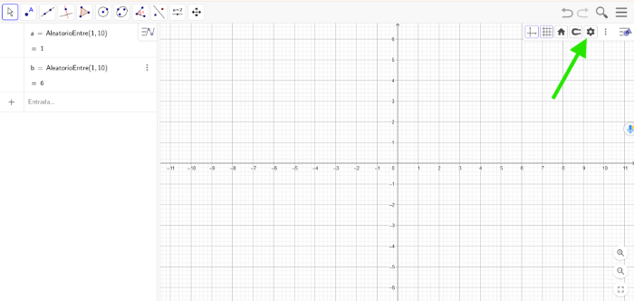 [b]PASO 1 – Crear las variables aleatorias[br][/b]En la barra de entrada, escribe:[br][br][list][*][code]a = AleatorioEntre(1, 10)[/code][br][/*][*][code]b = AleatorioEntre(1, 10)[/code][br][/*][/list][b][br](OPCIONAL) – Prepara la vista gráfica[/b][br]Antes de mostrar los textos o enunciados, vamos a dejar el lienzo limpio y ordenado.[br][br][list=1][*]Haz clic en el icono de rueda dentada (arriba a la derecha).[/*][*]En las pestañas que aparecen desactiva las opciones:[br][br][/*][list][*]Mostrar ejes[br][/*][*]Cuadrícula visible[br][br][/*][/list][*](Opcional) Ajusta el zoom para centrar la zona donde aparecerá el ejercicio.[/*][/list][i][br]Consejo[/i]: [i]Este paso es estético, pero ayuda mucho a que el resultado sea más claro y atractivo.[br] Cuando trabajes con alumnado, un entorno limpio mejora la atención visual.[/i]