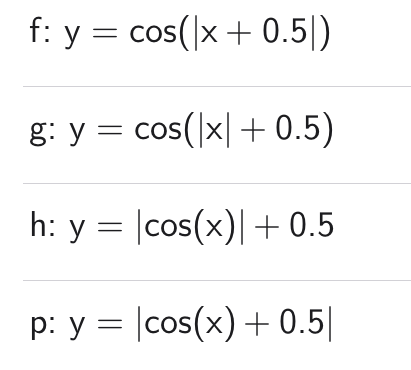 Visualizzando ciascuna funzione una alla volta descrivi le trasformazioni applicate rispetto alla funzione y=cosx (che puoi anche rappresentare se vuoi).[br]Ricorda: il fatto che ci sia un valore assoluto e la somma del termine +0.5 implica rispettivamente una [b]simmetria[/b] e una [b]traslazione[/b]. Riconosci come sono state effettuate!
