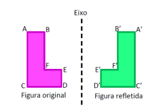 [u]Reflexão[br][/u][br]A reflexão é uma simetria, pois é uma transformação que considera a distância do conjunto de[br]pontos a uma reta e com essa distância reflete a figura no outro lado da reta – também chamada de eixo de simetria.