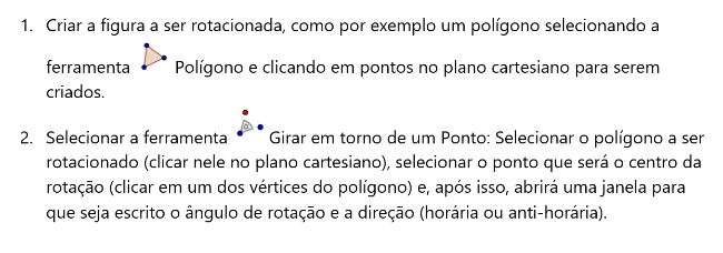 [u]Rotação[br][/u]A rotação é uma transformação que gira a imagem em torno de um ponto fixo – centro de rotação –considerando uma amplitude (ângulo da rotação). [br]