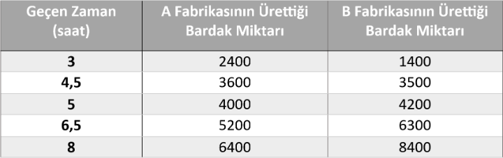 Elde ettiğiniz denklemden yararlanarak B fabrikasının saat kaçta A fabrikasından daha fazla bardak üretmeye başladığını hesaplayınız.