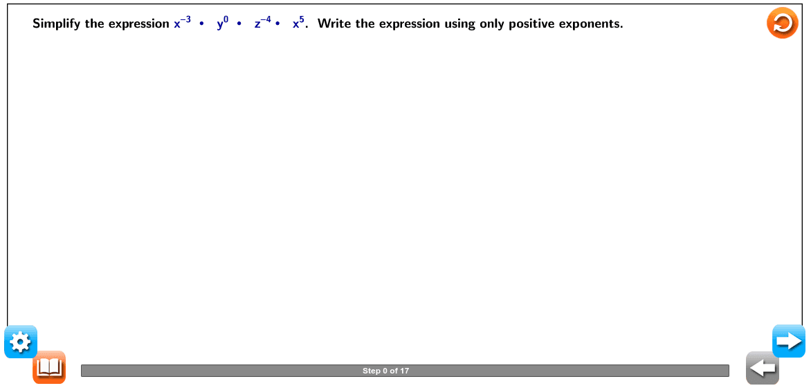 Simplify the expression [math]x^{–3} • y^0 • z^{–4} • x^5[/math]. Write the expression using only positive exponents. |