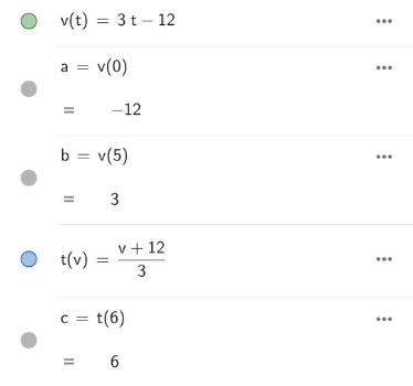 [size=150]A particle moves along a straight line and passes through a fixed point [i]O[/i]. Its velocity, [br][i]v[/i] ms[sup]-1[/sup], [i]t[/i] seconds after passing through the point [i]O [/i]is given by [math]v=3t-12[/math].[br][br](a) Calculate[br] (i) the initial velocity of the particle,[br] (ii) the instantaneous velocity, in ms[sup]-1[/sup], of the particle when [i]t=5[/i],[br] (iii) the time, in seconds, when the instantaneous velocity, in ms[sup]-1[/sup], of the particle is 6ms[sup]-1[/sup].[br][br][b]Solution:[/b][/size]