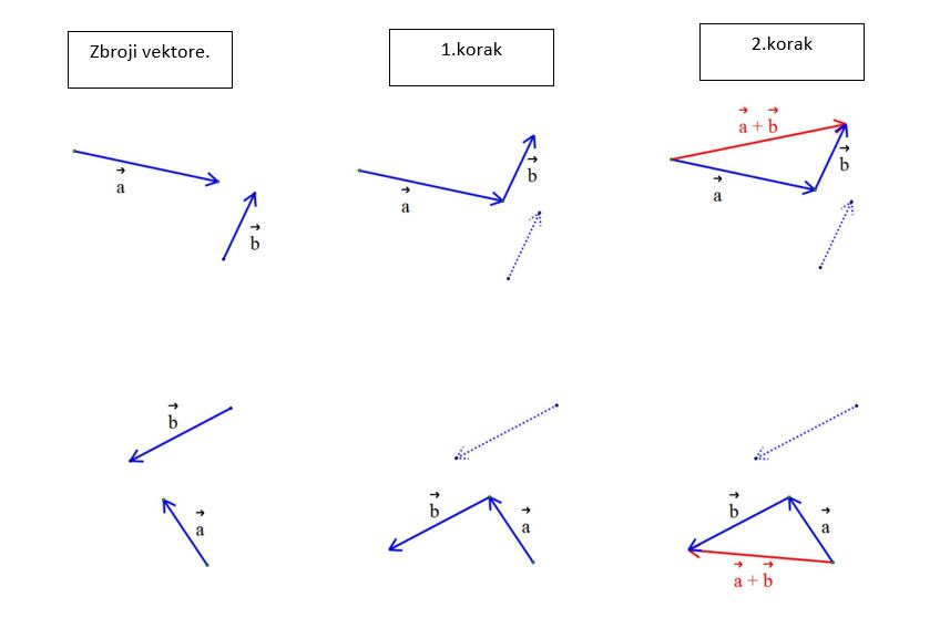 Zbrajanje vektora pravilom trokuta:[br]1. na završnu točku prvog vektora (paralelnim pomakom) nanesi početnu točku drugog vektora[br]2. nacrtaj vektor kojem je početne točka u početnoj točki prvog vektora, a završna točka u završnoj točki[br] drugog vektora[br]3. nacrtani vektor jest zbroj vektora