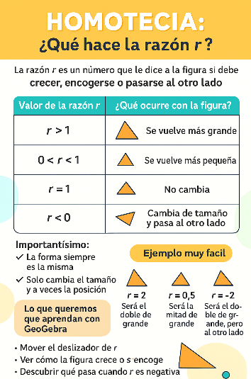 [size=100][size=85][size=150][b]LA HOMOTECIA[br][/b][/size][size=150][br]En esta lección aprenderán a:[br][br]- Identificar la razón de homotecia.[br]- Reconocer el centro de homotecia.[br]- Aplicar homotecias para agrandar o reducir figuras manteniendo su forma.[br][/size][/size][/size]
