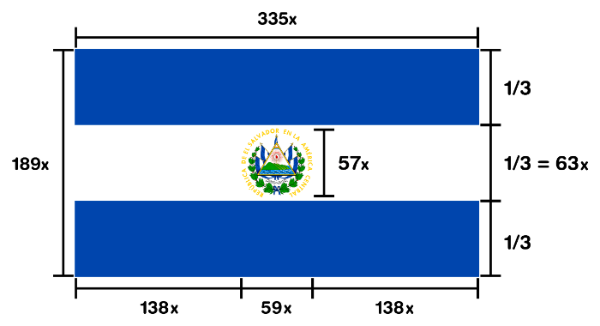 Vamos a construir la bandera de El Salvador debido a la peculiaridad de sus proporciones. Esta bandera tiene unas proporciones de [color=#0b5394][b]189 : 335[/b][/color]. Única que tiene esta proporción.[br][br]Aprovecharemos estas proporciones "tan extrañas" para introducir la división de un segmento en partes iguales en la línea de comandos ponderando el punto que queremos, en nuestro caso dividiremos el segmento AB en 335 partes y nos quedaremos con el punto que ocupa la parte 189. [br][br]El escudo se ha introducido como imagen al final de la construcción.[br][br]Las [url=https://es.wikipedia.org/wiki/Bandera_de_El_Salvador]normas de la bandera y el código de colores[/url] los podéis ver y seguir en las siguientes imágenes junto una imagen de la propia bandera.
