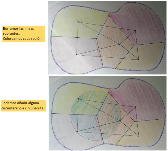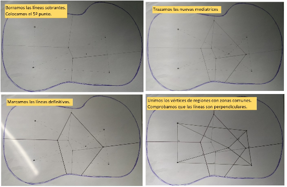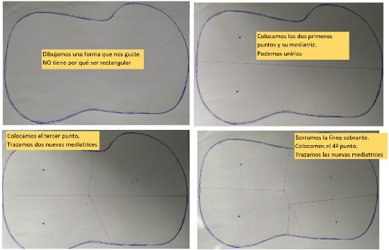 Vamos a crear nuestro propio diagrama de Voronoi:[br][list][*]Elegimos un [b]mapa[/b] (de una ciudad, campo de fútbol, parque,...), y el número de [b]personas[/b] que queremos usar para dividirlo. En vez de personas, pueden ser bares, parques... Por ejemplo ¿cómo queda dividida en zonas mi ciudad con los parques infantiles que tiene?[/*][*]Podemos obtener el mapa de una captura de pantalla de Google Maps, dibujarlo a mano, o incluso inventarlo. Si solo queremos la composición artística, podemos usar un folio en blanco.[/*][*]Trazamos, poco a poco el [b]diagrama[/b] (cada vez incluyendo un punto más). Como hay que ir borrando zonas, lo haremos [b]a lápiz[/b] y sin marcar mucho.[/*][*]Recuerda: las mediatrices pasan por el punto medio y son perpendiculares a la recta que une a las personas.[br][/*][*] Por último, coloreamos cada una de las zonas que hemos obtenido.[/*][*]Si quieres, puedes incluir la triangulación de Delaunay en tu dibujo, o marcar alguna de las circunferencias circunscritas. [br][/*][/list]Aquí tenemos un ejemplo de cómo ir haciendo nuestra creación artística: