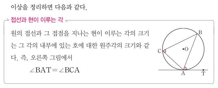 접선과 현 AB가 이루는 각의 크기는 호 AB의 원주각의 크기와 같다.