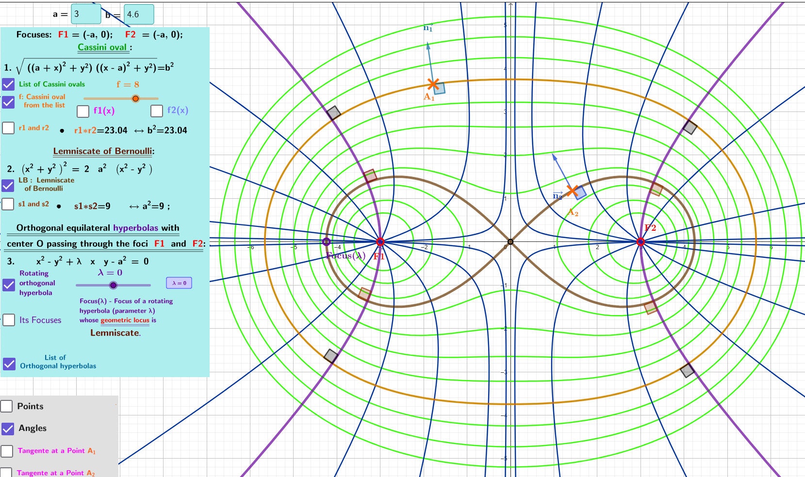 [size=85] The applet visualises the geometric properties of [url=https://en.wikipedia.org/wiki/Cassini_oval]Cassini lines[/url] and their associated [url=https://en.wikipedia.org/wiki/Lemniscate_of_Bernoulli]Bernoulli lemniscate[/url] - fourth-order curves that represent the locus of points such that the product of the distances of these lines to their two foci is constant.[br][br] 1. The [b][color=#980000]Lemniscate of Bernoulli[/color][/b] is from the [b]family of[/b] [b][color=#38761d]Cassini ovals[/color][/b] where b=a.[br] 2. For an [i]arbitrary[/i] point [b][color=#ff7700]A1[/color][/b] of the [b][color=#38761d]Cassini oval[/color][/b] with [b][color=#ff0000]foci[/color][/b]: [b][color=#ff0000]F1[/color][/b] and[b][color=#ff0000] F2[/color][/b] the [color=#1e84cc][b]normal[/b][/color] is the[color=#1e84cc] [b][url=https://en.wikipedia.org/wiki/Symmedian]symmedian[/url][/b][/color] of the triangle [b]△[color=#ff0000]F1[/color][color=#ff7700]A[sub]1[/sub][/color][color=#ff0000]F2[/color][/b].[br] For an [i]arbitrary[/i] point [b][color=#ff7700]A2[/color][/b] of the [b][color=#980000]lemniscate of Bernoulli[/color][/b] with [b][color=#ff0000]foci:[/color][/b] [b][color=#ff0000]F1[/color][/b] and [b][color=#ff0000]F2[/color][/b] the [b][color=#1e84cc]normal[/color][/b] is the [b][color=#1e84cc]symmedian[/color][/b] of the triangle [b]△[color=#ff0000]F1[/color][color=#ff7700]A[sub]2[/sub][/color][color=#ff0000]F2[/color][/b].[br] 3. The [color=#333333]rectangular (or equilateral)[/color][b] [url=https://en.wikipedia.org/wiki/Conic_section#Standard_forms_in_Cartesian_coordinates]hyperbolas[/url]:[/b] [b]x² - y² + λ x y - a² =0 [i]o[url=https://en.wikipedia.org/wiki/Cassini_oval#Cassini_ovals_and_orthogonal_trajectories]rthogonally[/url][/i][/b] intersect both the [b]family of[/b] [b][color=#38761d]Cassini ovals[/color][/b] and the [b][color=#980000]Bernoulli lemniscate[/color][/b] with the same[b] [color=#ff0000]foci[/color]: [color=#ff0000]F1[/color][/b] and [b][color=#ff0000]F2[/color][/b]. Moreover, the [b]locus[/b] of the [b][color=#9900ff]foc[/color][/b]i of these [b][color=#9900ff]hyperbolas[/color][/b] is the [b][color=#980000]lemniscate of Bernoulli.[/color][/b][/size]