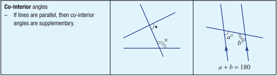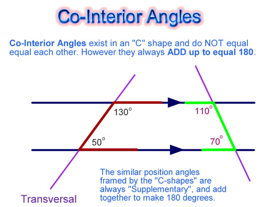 Co-interior angles are two angles on the same side of the transversal. They are the inside or interior angles and their sums add to 180[math]^\circ[/math]. Use the two animations below to explore and test this angle relationship. Additionally, in the first animation, drag around the point "A" to manipulate the drawing.