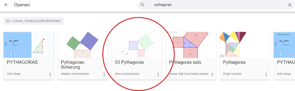 Typ "[i]Pythagoras[/i]" in het zoekveld en open het werkblad van dina.meulebrouck.[br][br]Als je een venster krijgt met de vraag of je wil opslaan of verwerpen, mag je kiezen voor verwerpen. Je wil het bestand dat je daarnet hebt geopend vermoedelijk nog niet bewaren.