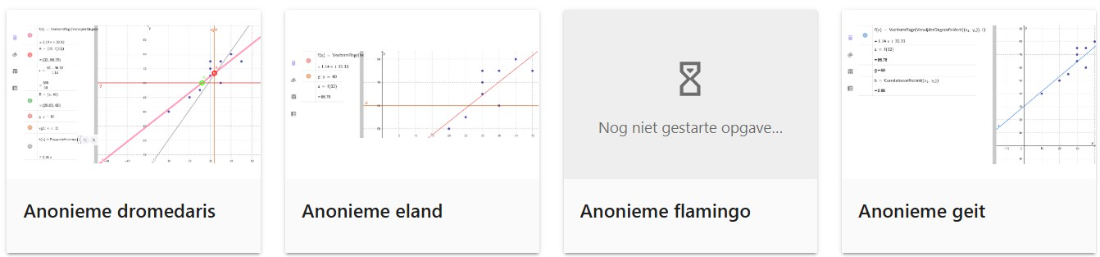 [list][*]Klik in het lesoverzicht op de naam van een werkblad met een of meerdere opgaven.[/*][*]Klik rechts op [b]DETAILS [/b]om het werk van je leerlingen te bekijken.[/*][/list]In je lerarenweergave krijg je nu een in miniatuurweergaven een klasoverzicht van het werk aan deze opgave. Wie is klaar? Wie is nog niet begonnen? Wie experimenteert?...De miniatuurafbeeldingen van deze taken worden in realtime geupdated (elke 2 seconden) zodat je de vooruitgang van je leerlingen kunt volgen terwijl ze aan de taak werken.[br]Een mogelijk type van opgave is een GeoGebra applet.