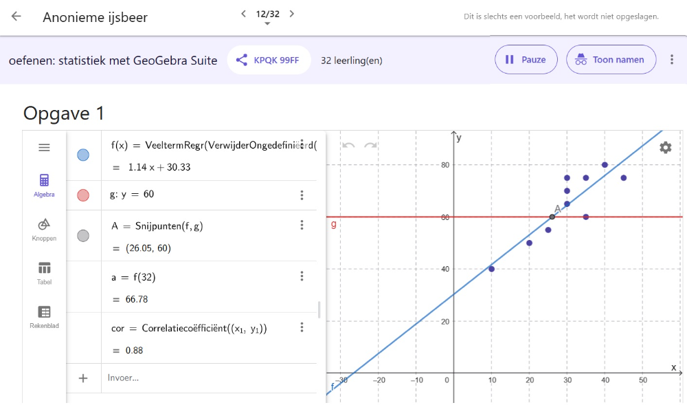 Klik op de naam van een willekeurige leerling voor een gedetailleerde weergave van zijn/haar werk. Je roept m.a.w. een leerling virtueel aan het bord. Als leerkracht kan je in deze weergave vrij werken, objecten toevoegen enz. maar wat je doet wordt niet aangepast of opgeslagen in het echte werk van de leerling.[br]Je kan de pagina verversen voor een update van de constructie van de leerling. [br][br][list][*]Via de pijl links ga je terug naar het klasoverzicht van de taak. Van daar kan je via de menuknop terug naar het lesoverzicht.[/*][*]Met de pijltjes in het midden kan je naar het werk van een vorige of volgende leerling.[/*][/list]