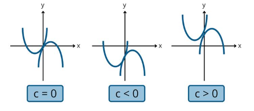 [b]3. Hubungan nilai [/b][math]c[/math][b] terhadap fungsi kuadrat[/b][br] Titik potong grafik fungsi kuadrat ditentukan oleh nilai konstanta [math]c[/math], pada bentuk umum fungsi kuadrat [math]f\left(x\right)=ax^2+bx+c[/math]. Nilai konstanta [math]c[/math] merupakan titik potong sumbu y dari kurva yang dibentuk fungsi kuadrat, yaitu titik [math]\left(0,c\right)[/math].[br] [math]\bullet[/math] [math]c>0[/math] kurva parabola memotong sumbu Y [b]positif[/b][br] [math]\bullet[/math] [math]c=0[/math] kurva parabola memotong sumbu Y [b]di titik pusat [/b][math]\left(0,0\right)[/math][br] [math]\bullet[/math] [math]c<0[/math] kurva parabola memotong sumbu Y [b]negatif[/b]