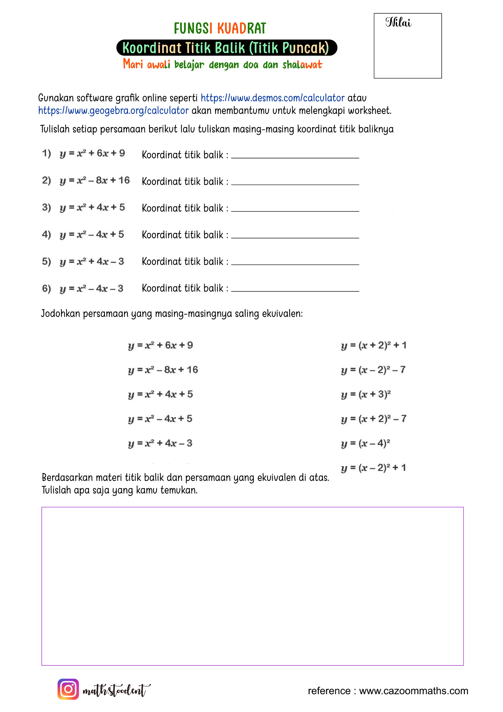 d. Berdasarkan nilai diskriminannya, maka grafik fungsi kuadrat mempunyai .... dan memotomg sumbu X di ...