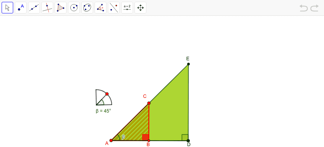 [b]2. Agora, [/b]fixe um dado valor de [math]\beta[/math] (não altere o seu valor).[br]No canto superior esquerdo, selecione [icon]/images/ggb/toolbar/mode_move.png[/icon] e movimente o ponto D.[br][color=#3d85c6][b]Observe[/b][/color] quais as alterações sofridas na figura, conforme movimenta o ponto D.[br]- os ângulos internos de [ABC] mantêm-se iguais?[br]- os ângulos internos de [ADE] mantêm-se iguais?[br]- os lados dos triângulos [ABC] e [ADE]?[br]- qual a relação entre os dois triângulos, [ABC] e [ADE]?[br]