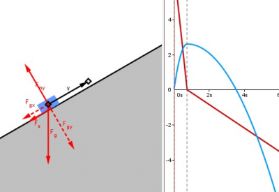 Az animáció a súrlódásos, változtatható hajlásszögű lejtőn felfelé vagy lefelé, változtatható kezdősebességgel elindított test mozgását vizsgálja.